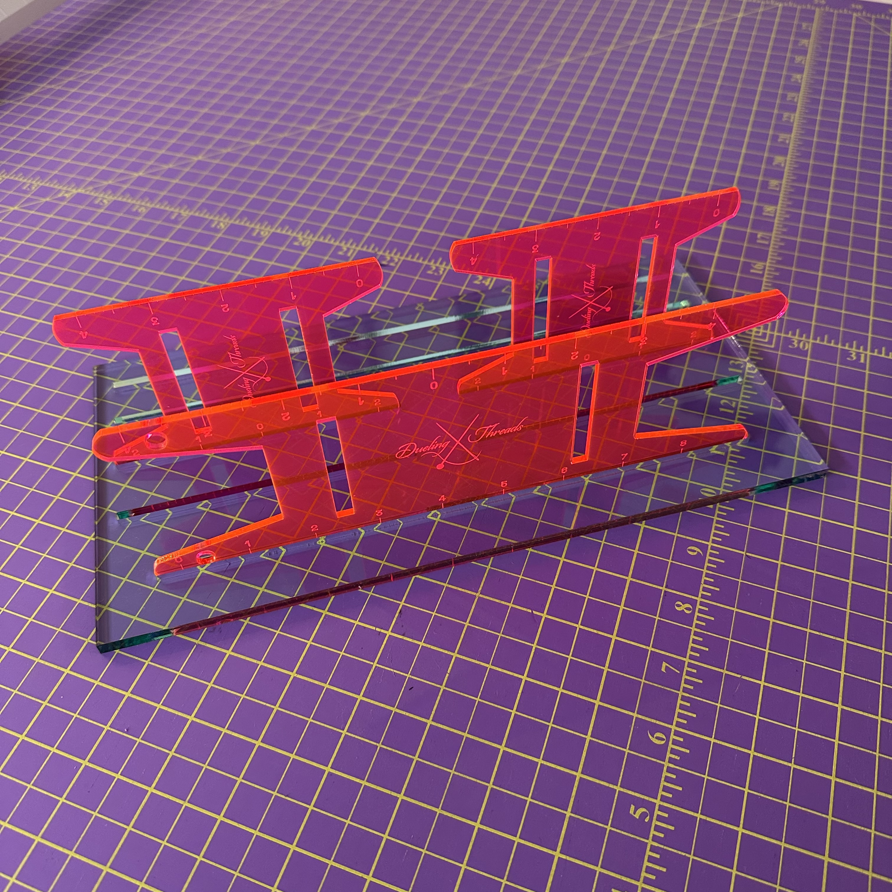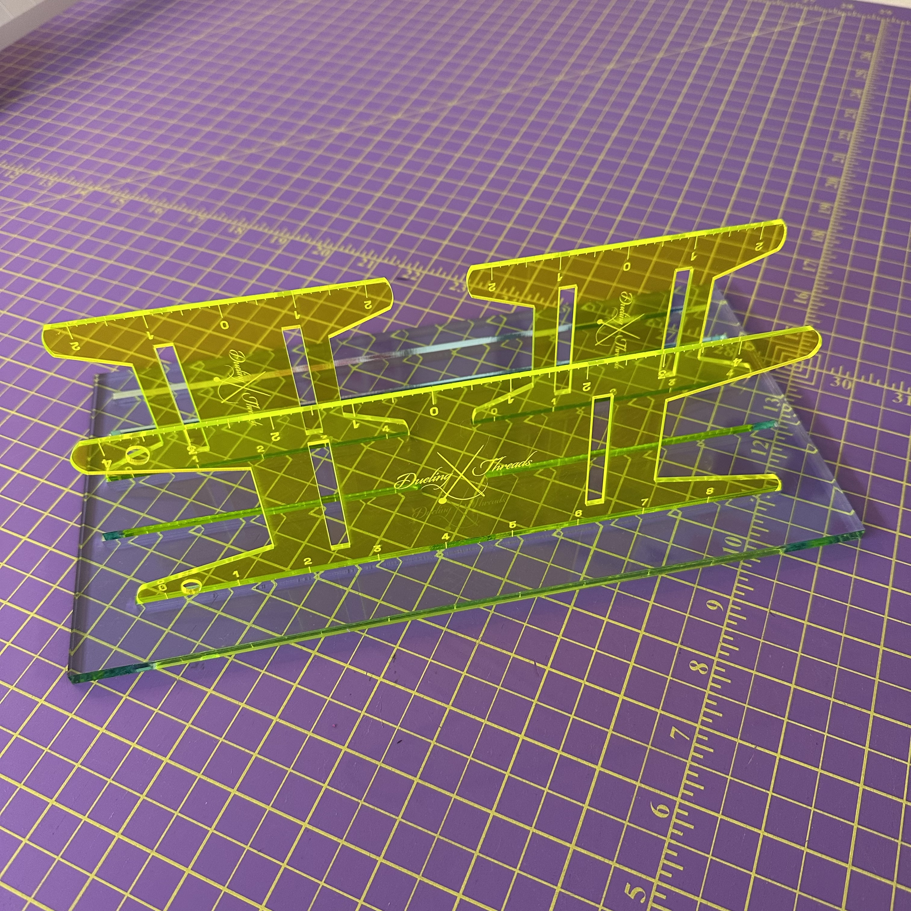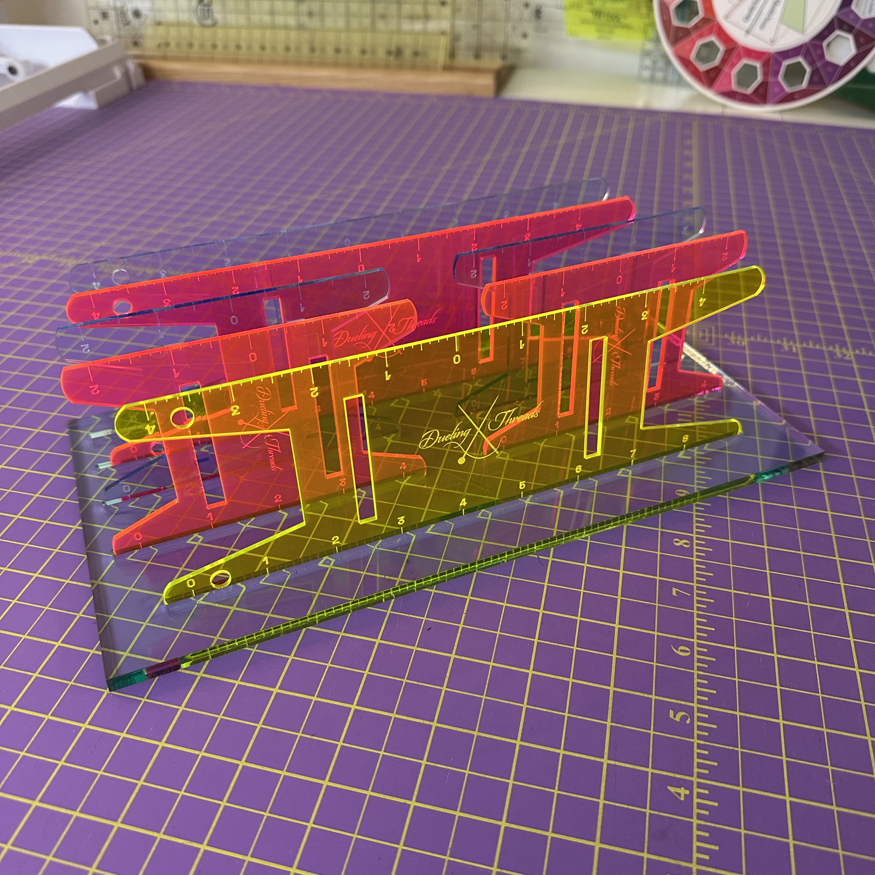 Meet your new sewing sidekick: the Binding Hive™, a sleek, sturdy organizer designed to keep your binding reels neat, visible, and ready for action. Crafted from durable 1/2″ acrylic, this drawer-friendly base features dual slots to hold two sizes of my signature Ruler Reels—custom laser-engraved binding spools that double as cutting tools.