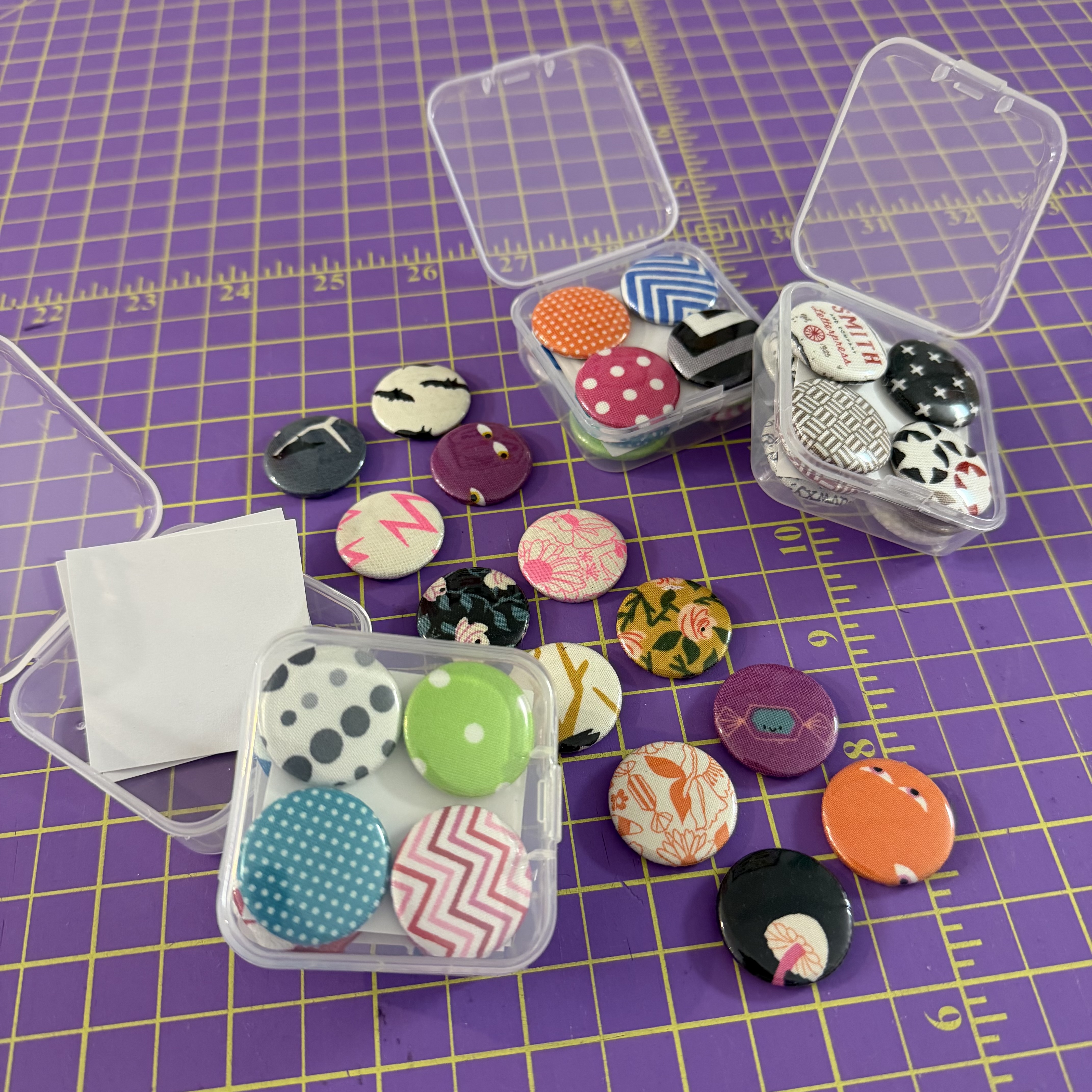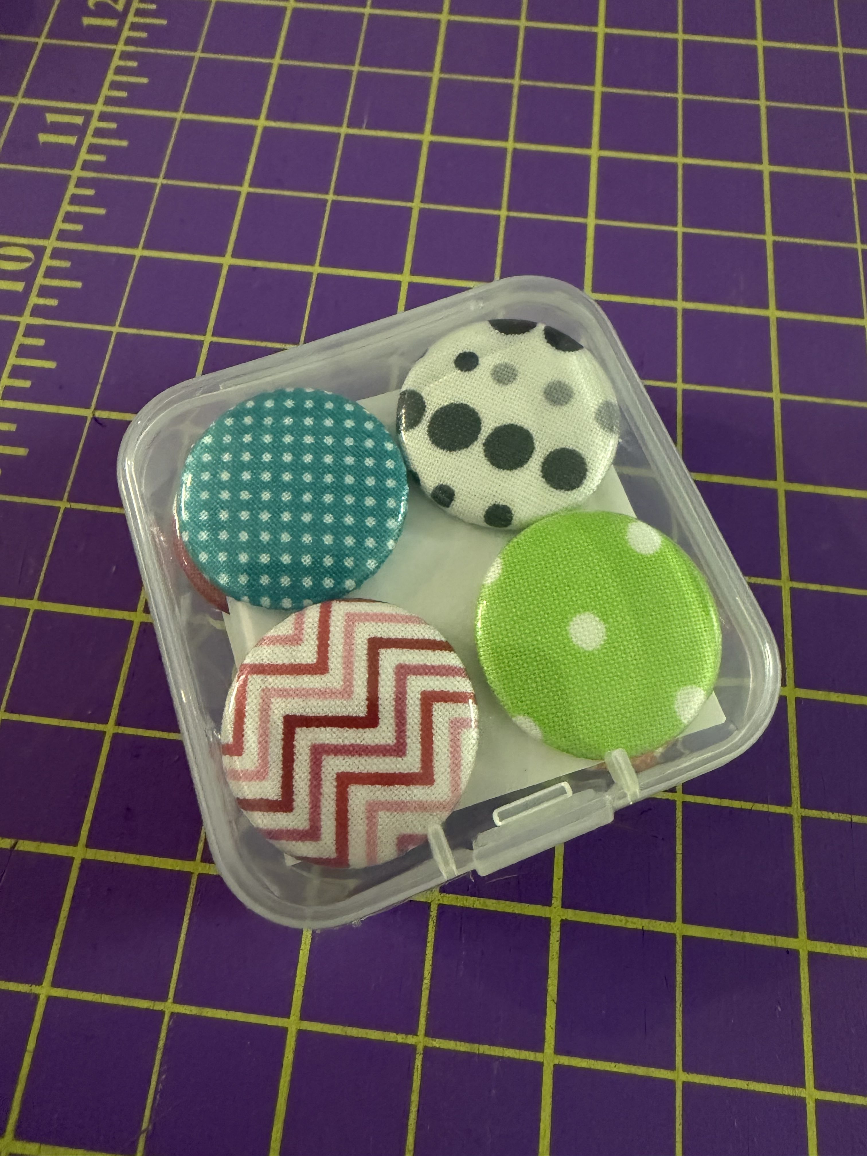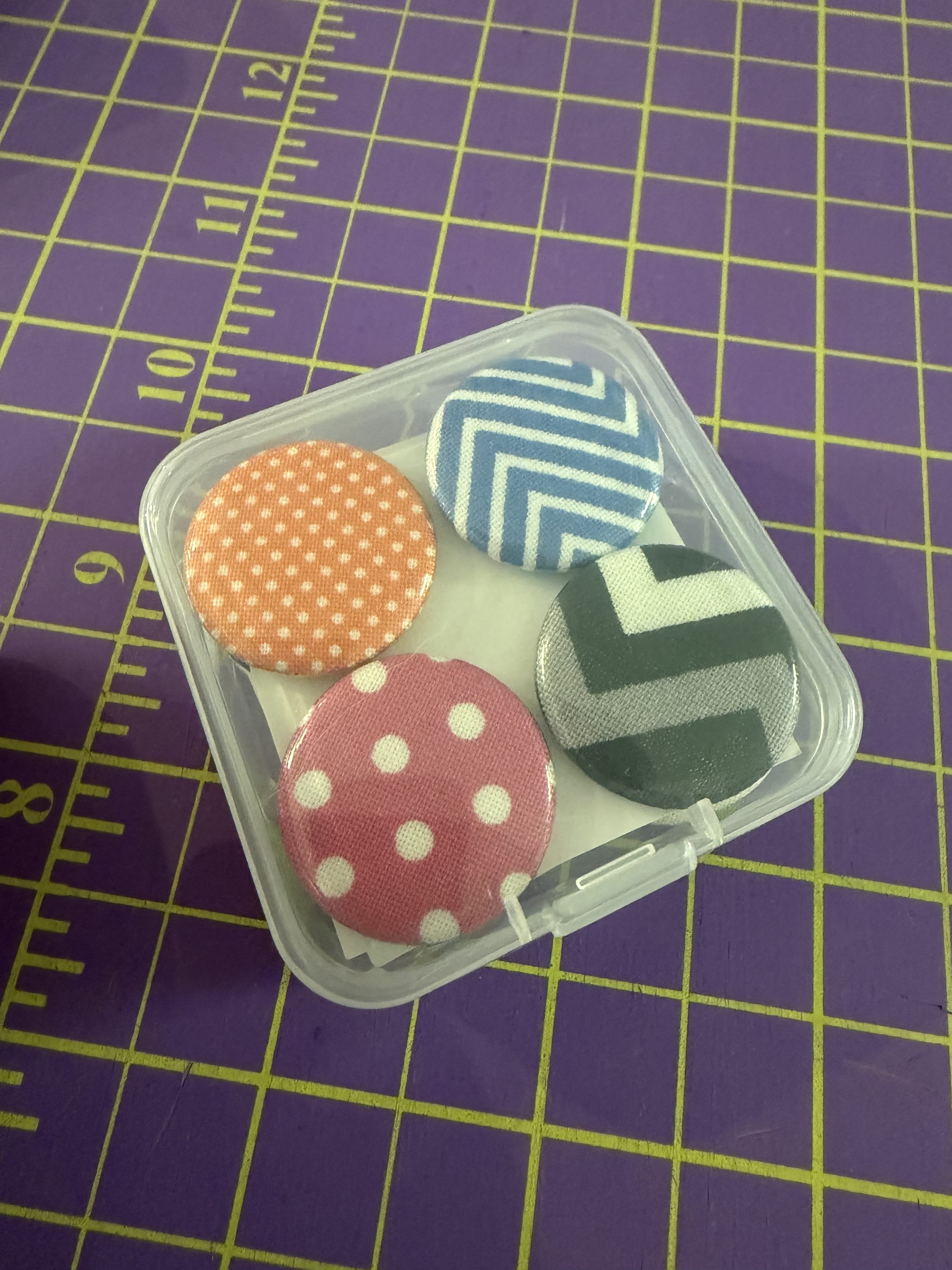 Bright, bold, and beautifully scrappy! These sets of 12 handmade fabric-covered button magnets bring quilty charm to any magnetic surface. Each 25mm magnet is wrapped in colorful cotton from my studio stash—no two are exactly alike! Packaged in a clear plastic case and ready to gift (or keep).