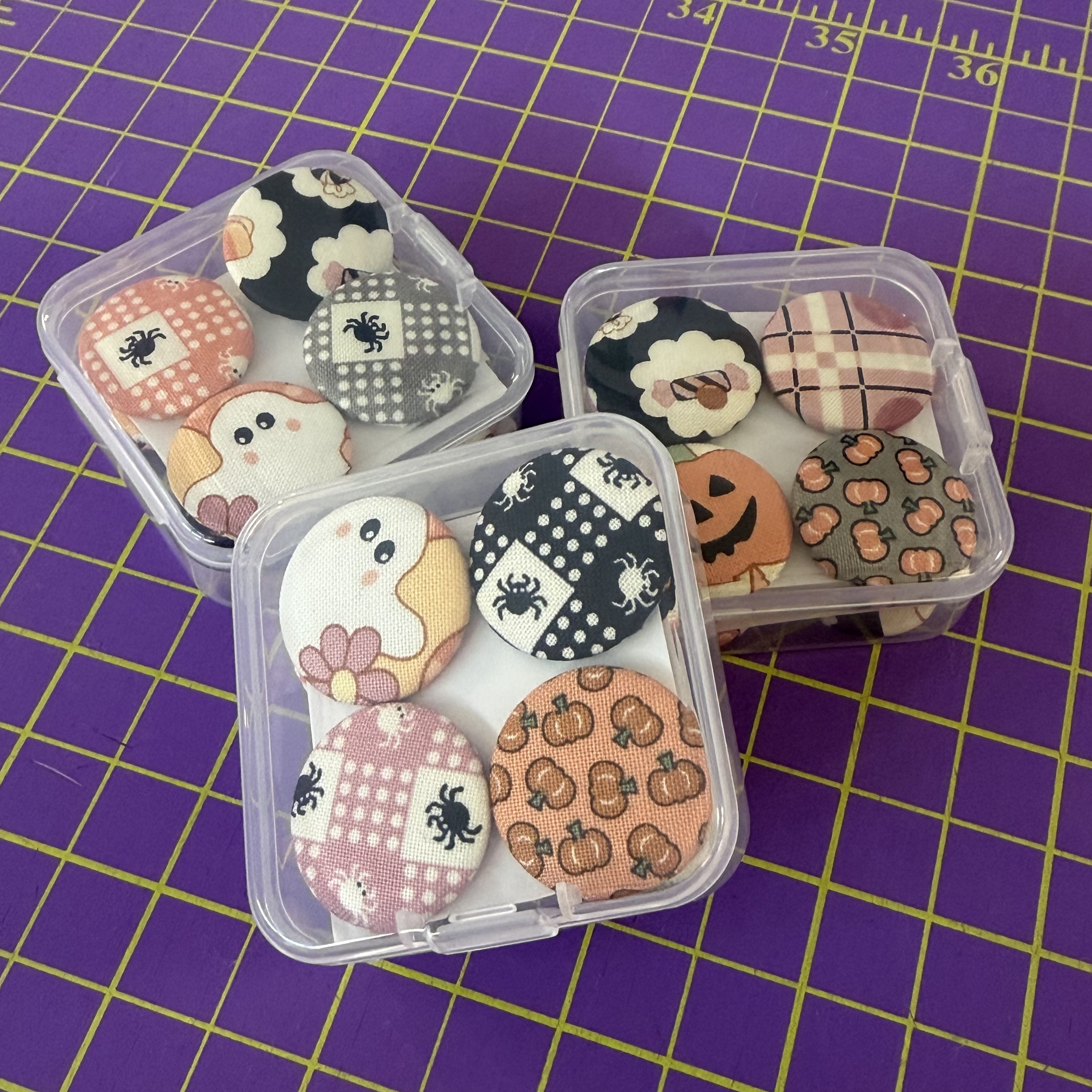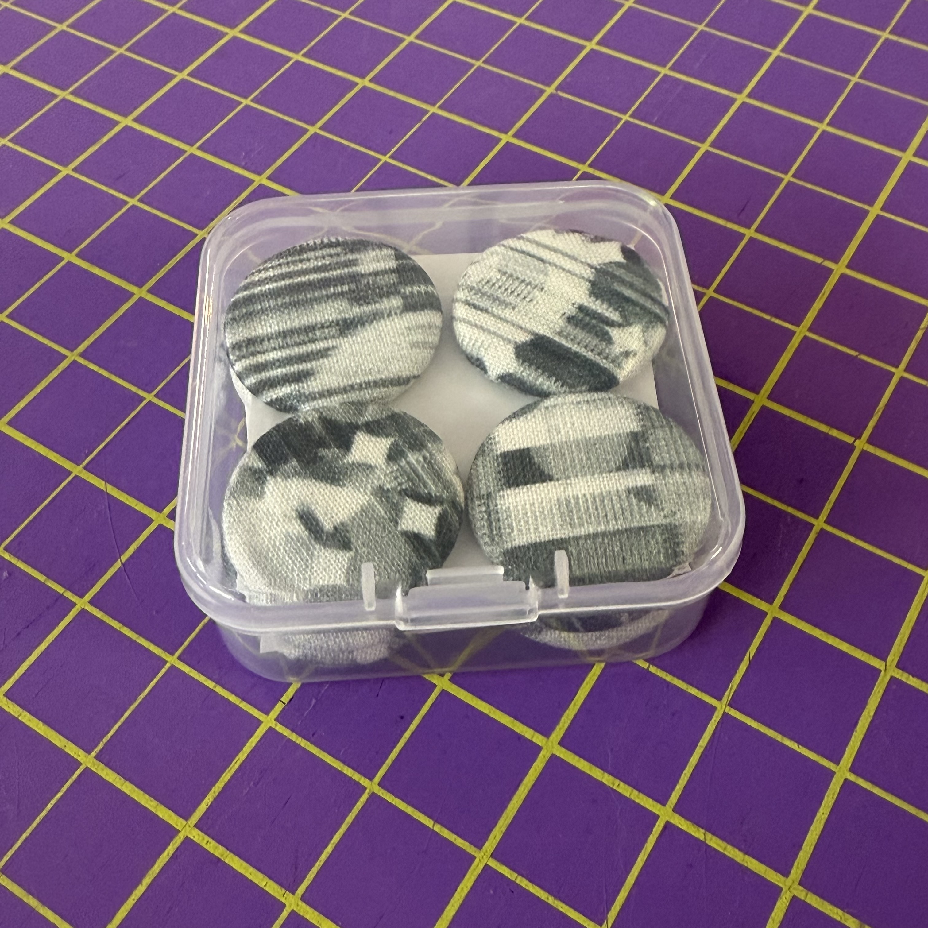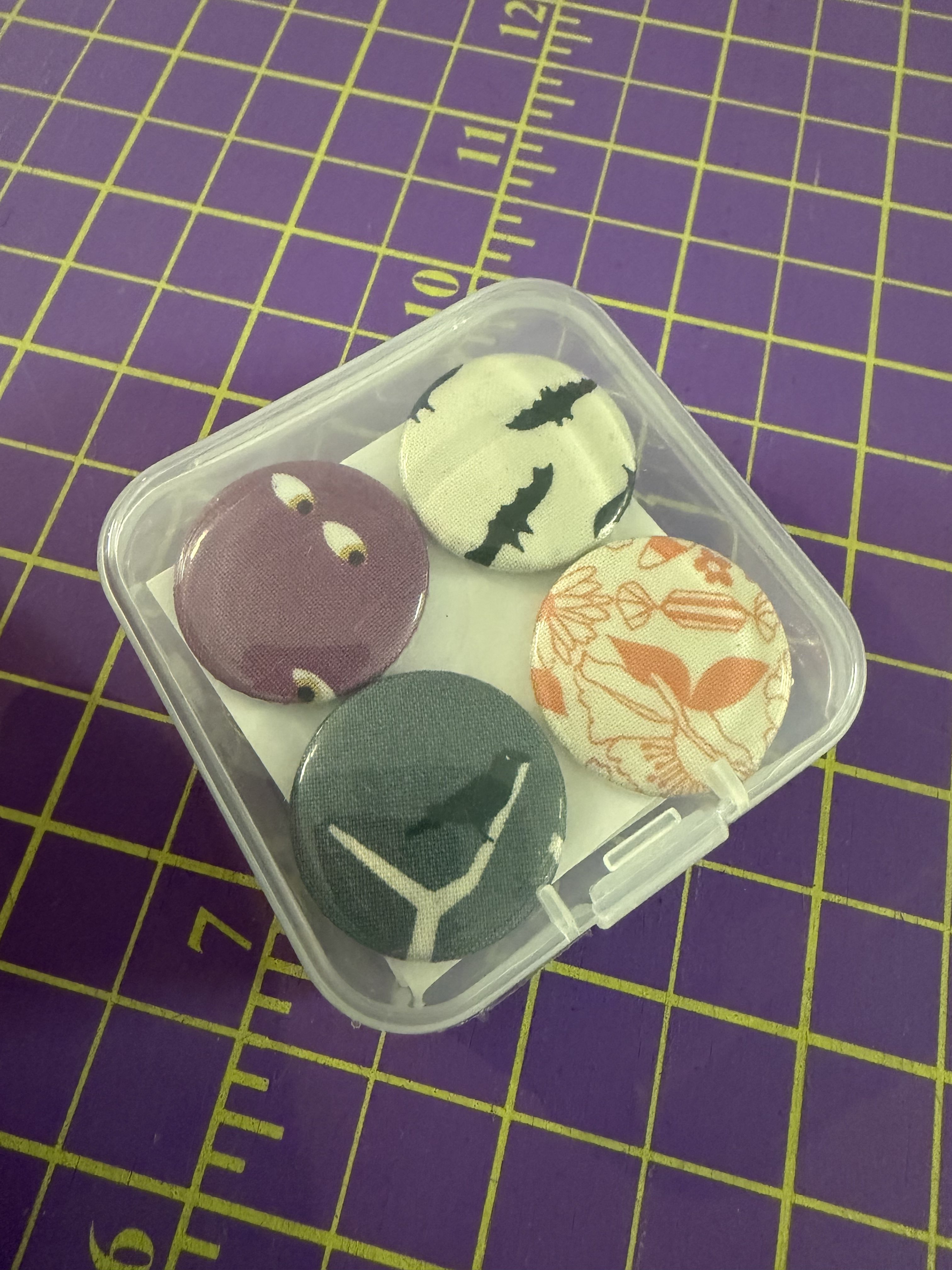 Set includes 12 fabric-covered button magnets